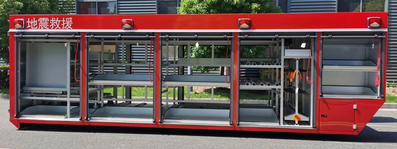 3.2 | 多功能器材模塊箱:箱體左右兩側設有防水、防塵的鋁合金卷簾門,卷簾門觸發電磁傳感器自動開關LED照明。箱體內根據器材使用方式不 同設置有各種專用拖架、破拆工具拖架、抽屜、推車模塊、可調器材盒等機構放 置和固定各種器材裝備,在裝卸和運輸過程中不會發生移動。可放置器材:130件 |