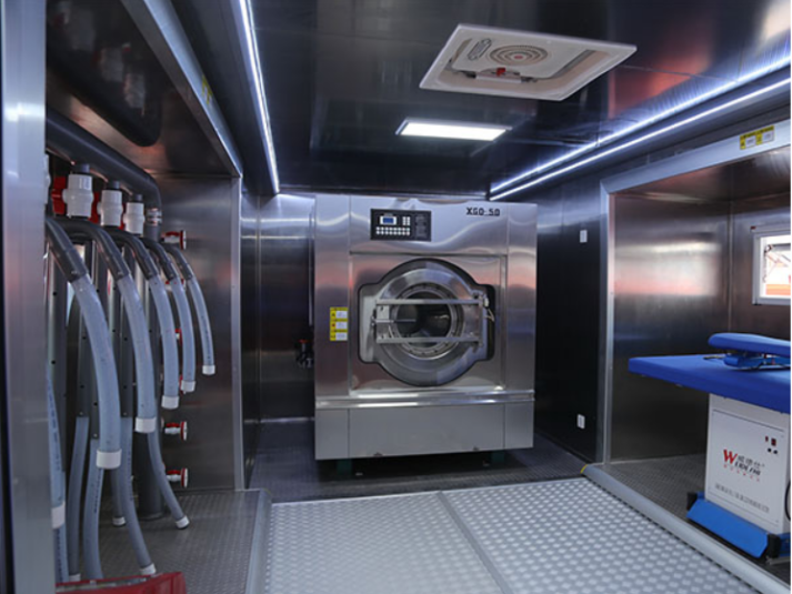 3.1 | 結構設計:廂體采用廂式大板粘接結構,表面采用鋁合金板粘結,外蒙皮采用電泳預噴 烤漆附膜鋁板,內蒙皮采用鋁合金板,廂體內外包型材、門結構采用陽極氧化處理過的鋁型材,具有耐腐蝕、保溫、強度高、外型美觀的特性。內骨架箱體采用鋁型材、輕鋁合金型材。箱板采用鋁面、加鋅板材,符合質輕、防銹、堅固、保溫、防塵、防水的要 求。所有小五金件采用不銹鋼或鋁合金材質,耐腐蝕、防銹蝕的經久耐用。骨架采用高 強度優質鋼材,外表面為優質鋁板,陽極氧化處理,以確保其剛度和強度。車身地板采 用防滑花紋鋁板。內飾采用鋁合金板。 車廂從前至后依次設置設備區 (水罐、洗脫烘一體機) 、衣物儲存區,能滿足最大60kg/批衣物洗脫烘和晾曬要求。 箱體內部按照洗滌操作流程布局艙,安裝40KVA取力發電機,2臺25KG洗脫烘一體機。 制作工藝:箱體復合板使用外鋁蒙皮內玻璃鋼蒙皮,中間為金屬骨架結構,既保證了箱體的強度,又減輕了箱體重量。復合板中間填充保溫隔熱材料,既提高箱體整體強度也提高了保溫隔熱效果、防水、防潮。 |