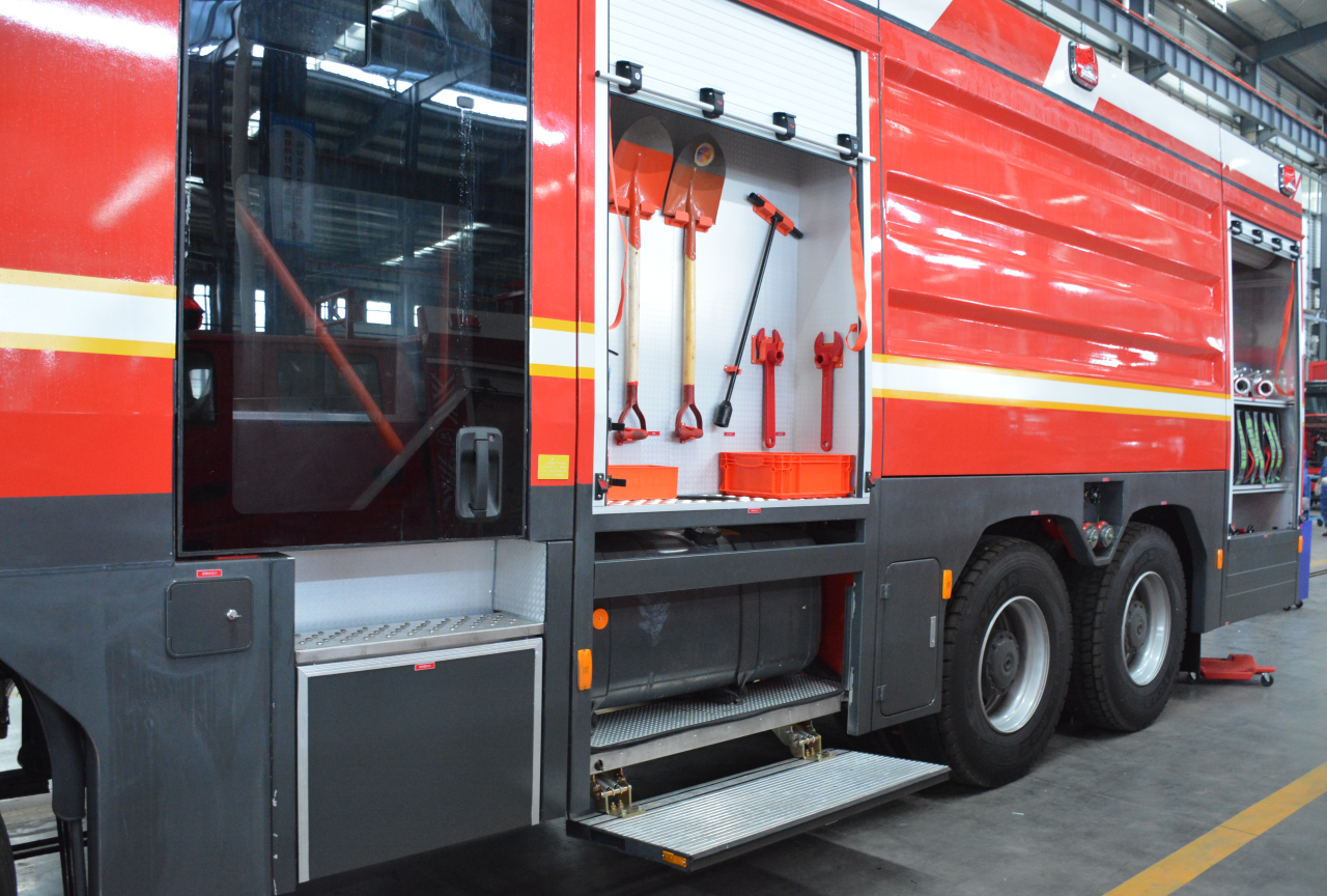 該泡沫消防車,整車主要由梅賽德斯-奔馳 Arocs 4158型消防車專用底盤、**乘員室、水罐、泵室、泵送系統、智能集成**系統、水**、水炮、隨車消防器材以及其他附屬**等組成。整車改裝后載荷分配均勻,質心位置和穩定性計算**,內部空間布局合理,能充分滿足操作人員的使用要求。