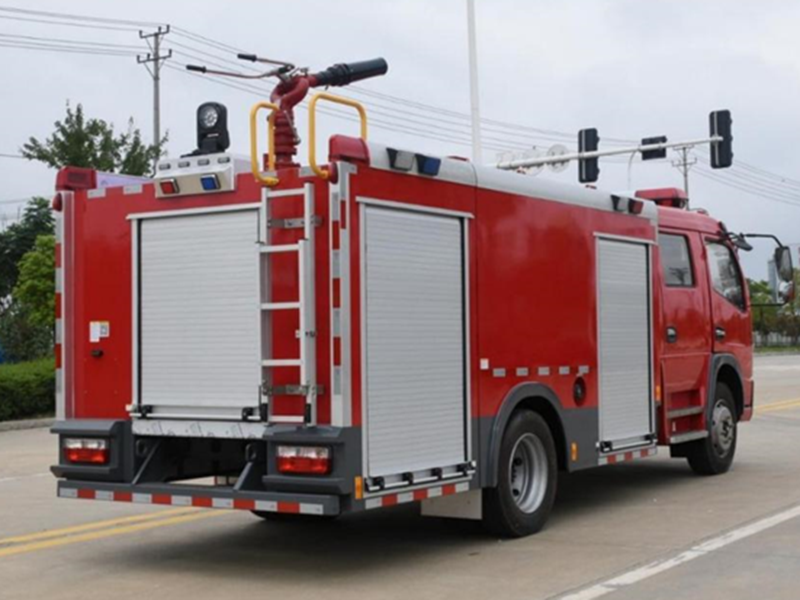 多利卡水罐消防車是由二類汽車底盤、水罐、水泵、管路、儀表電路系統等部件組 成,該車裝配鋁合金后爬梯(可拆卸),泵房在整車尾部,罐體為鋼板焊接式,水罐材